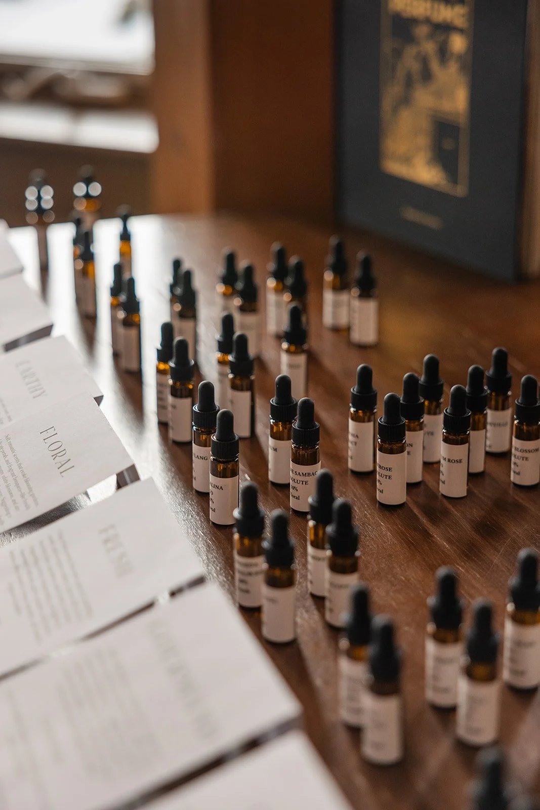 We offer guided classes where you learn the basics of perfumery (history, scent families, blending techniques) and create your own custom 30 mL botanical eau de parfum using high-quality essential oils and absolutes. 100% botanicals. 0% synthetics.